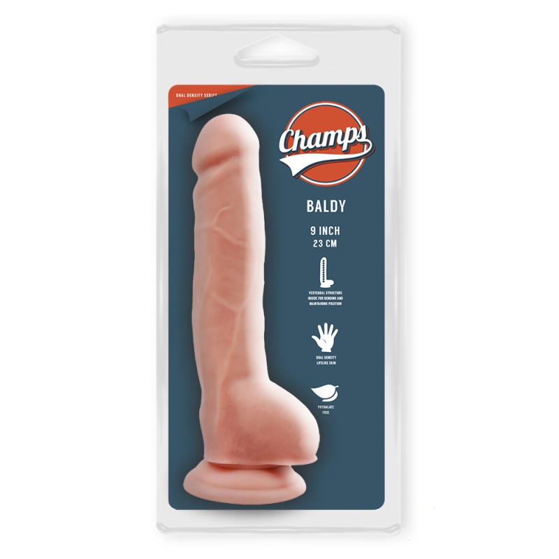 BALDY munandite ja iminapaga dildo on sisemuses kõva ning pealispind on pehme ja liikuv nagu päris nahk. Lisaks on talle sisse ehitatud nn. selgroog, mis abil saab teda painutada ja hoida igasuguseid asendeid.