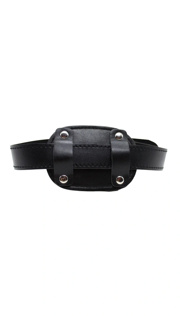 The adjustable strap with a metal buckle and padlock ensures a secure and unyielding fit, reinforcing the dynamic of dominance and control.