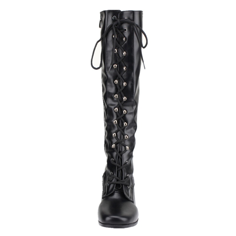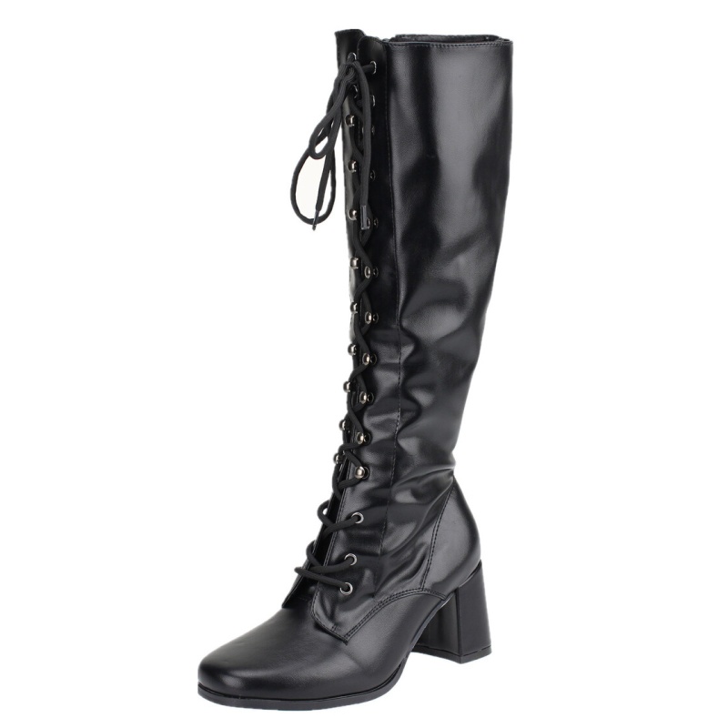 Kõrge säärega, kunstnahast, eest nööritavad saapad.