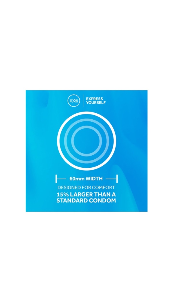 Suuremad kondoomid (60 mm) on anatoomilise kujuga, otsas reservuaariga, naturaalsest lateksist ja silikoonlibestiga libestatud, elektrooniliselt testitud.