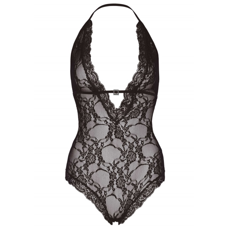 Mustast pitsist, sügava V-kaelusega ühes tükis pesukomplekt.