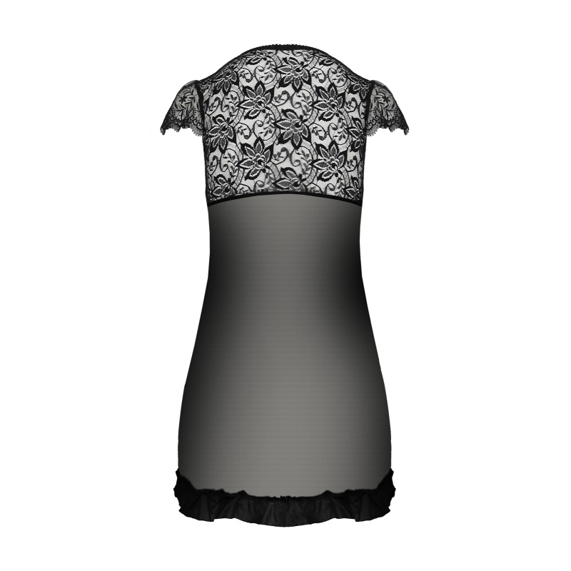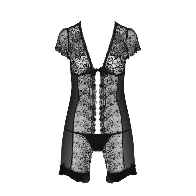 Mustast pitsist ja tüllist eest lipsukesega seotav võrgutavalt napp hommikumantel. Komplekti kuuluvad ka stringid.