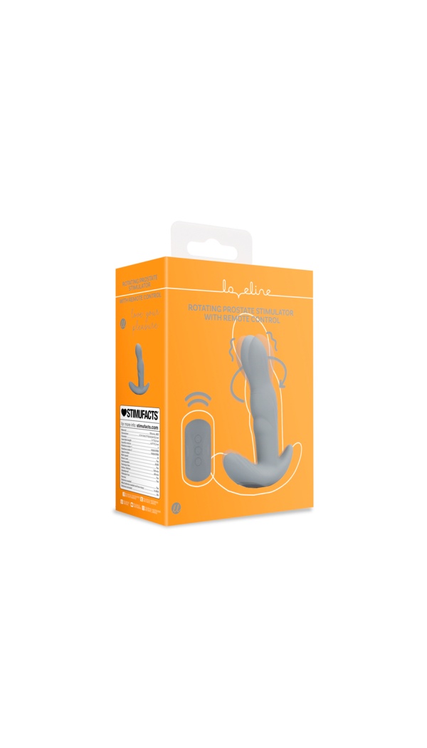 Rotating prostate vibrator with remote, dual stimulation, 10 modes, 13.3 cm length. Rechargeable, 60 min use, not waterproof.
