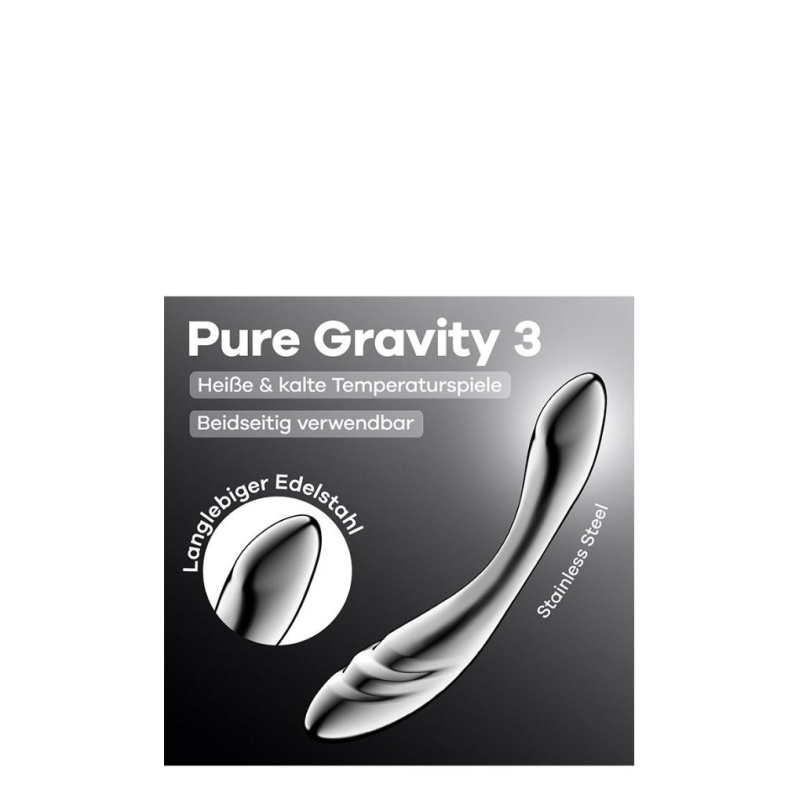 Tänu oma raskusele teeb terasdildo suurema osa tööst teie eest ära – te ei pea peaaegu üldse survet avaldama ning saate istuda ja lõõgastuda ning nautida. Oma 21-sentimeetrise kogupikkuse ja roostevabast terasest pinnaga on Satisfyer Pure Gravity 3 teie kollektsiooni uus ere täht - olgu see kuum või külm – tänu selle vastupidavale materjalile saate dildot mõneks minutiks sügavkülmikus jahutada või kuuma vee all soojendada!