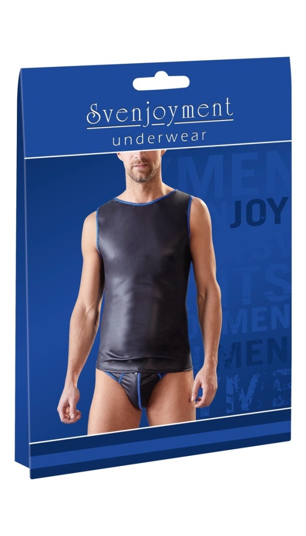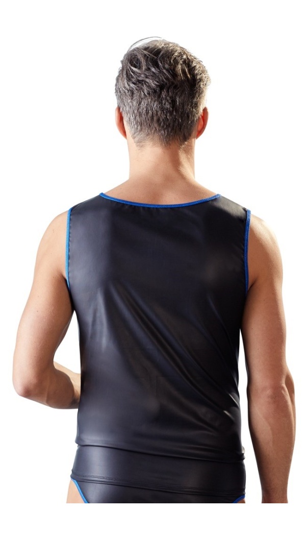 Kitsa lõikega särk kergelt venivast mustast kangast. Mati pinnaga, kontrastsinises toonis õmmeldud õmblustega. Varrukateta.