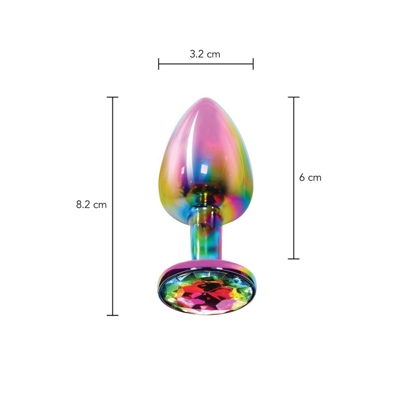 Kergest alumiiniumist ja mitmevärvilise kroomkihiga kaunistatud, suure vikerkaarevärvides sädeleva kivikesega anaaltapp.