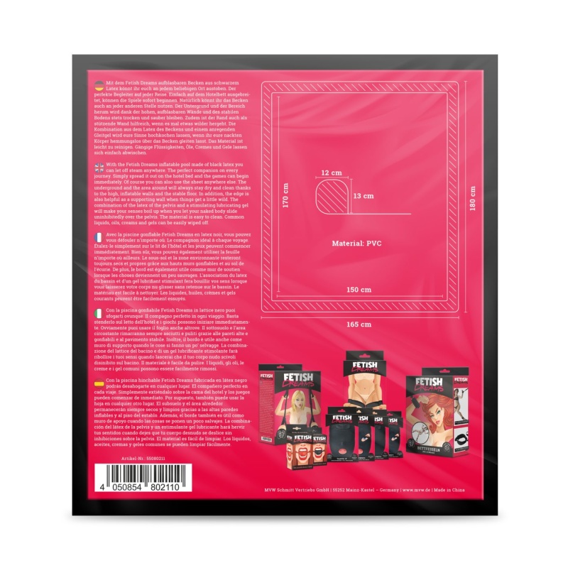 With the Fetish Dreams inflatable pool made of black pvc you can let off steam anywhere. The perfect companion on every journey. Simply spread it out on the hotel bed and the games can begin immediately. Of course you can also use the sheet anywhere else. The underground and the area around will always stay dry and clean thanks to the high, inflatable walls and the stable floor. In addition, the edge is also helpful as a supporting wall when things get a little wild. The combination of the latex of the pelvis and a stimulating lubricating gel will make your senses boil up when you let your naked body slide uninhibitedly over the pelvis. The material is easy to clean. Common liquids, oils, creams and gels can be easily wiped off.