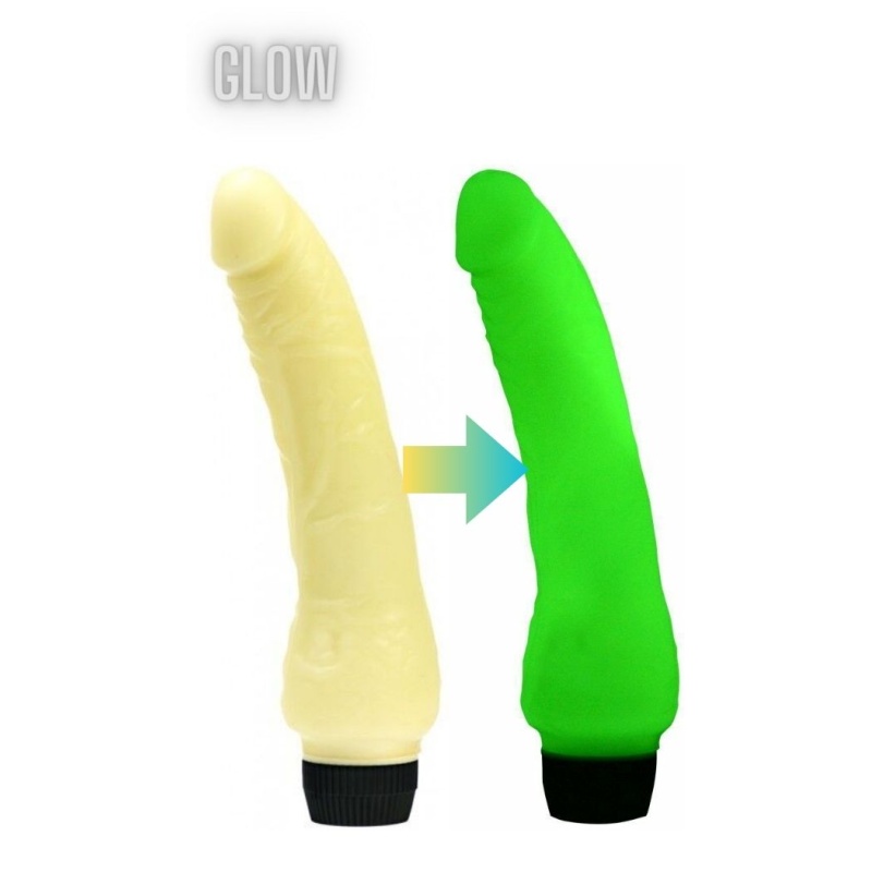 Klassikaline kergelt kaarja kujuga pimedas helendav vibraator. Hoia vibraatorit mõnda aega ereda valguse käes, seejärel helendub roheliselt.