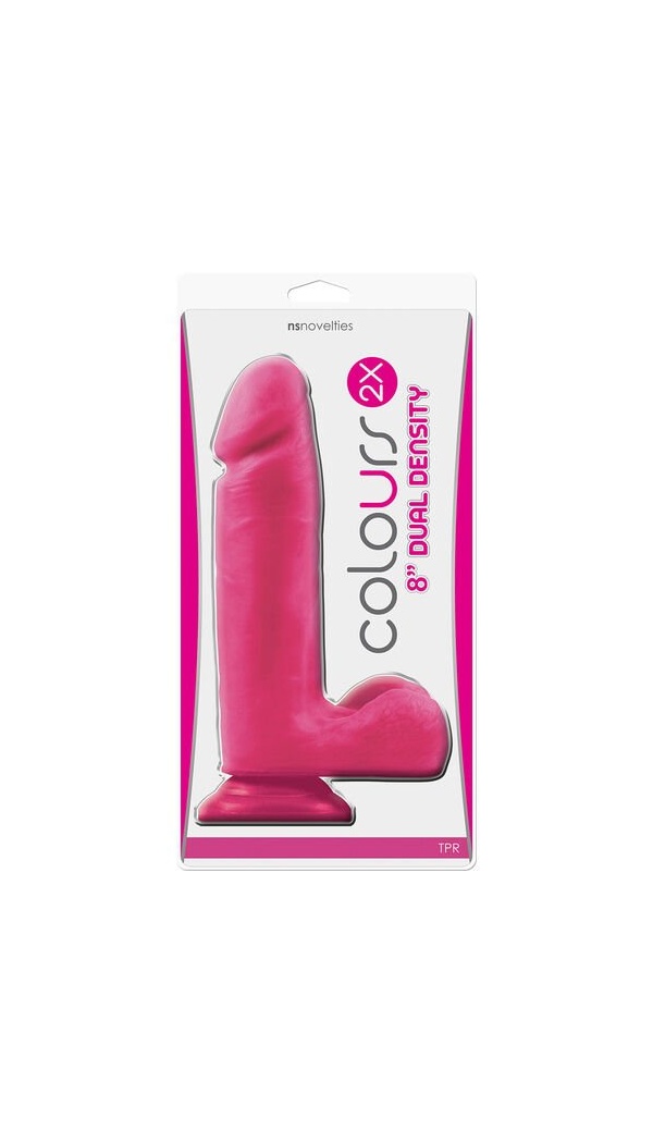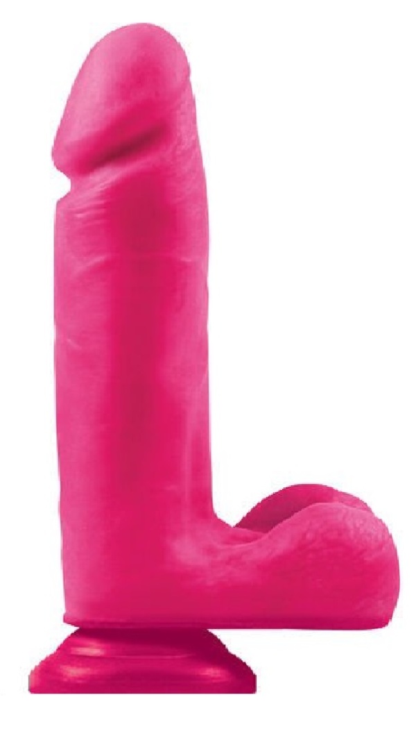 Põnevalt roosat värvi tugeva iminapa ja munanditega dildo, mille pealmine kiht on nahaga sarnanev pehmem materjal ning siseosa on kõvem ja tugevam,