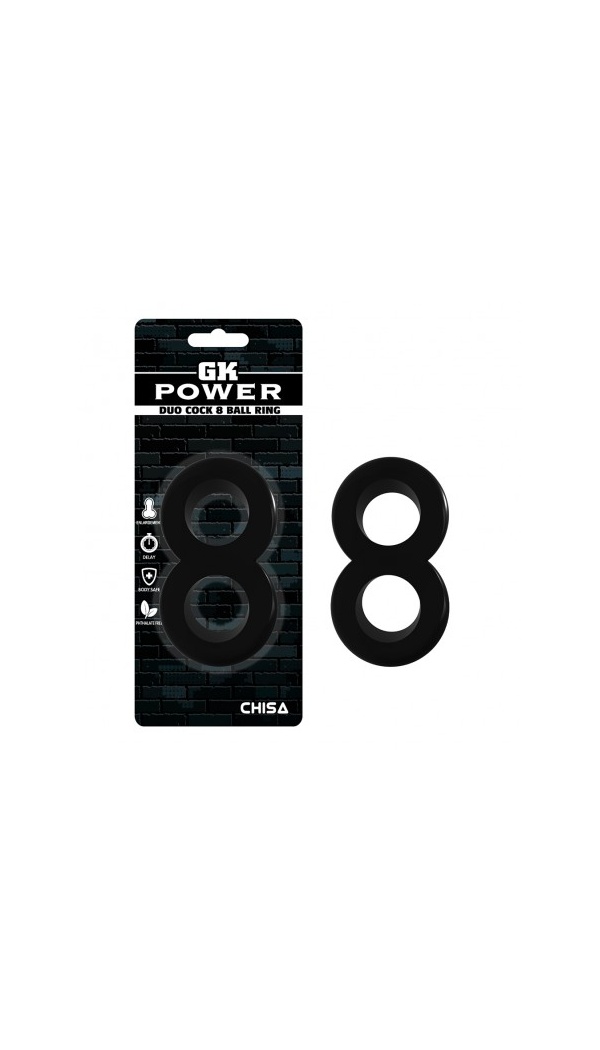 Duo Cock 8 Ball Ring kahe ühendatud rõngaga disain avaldab peenisele täiendavat survet, mis võib aidata säilitada erektsiooni kauem ja aeglustada ejakulatsiooni. See on valmistatud kehale ohutust ftalaadi- ja lateksivabast TPE-st.