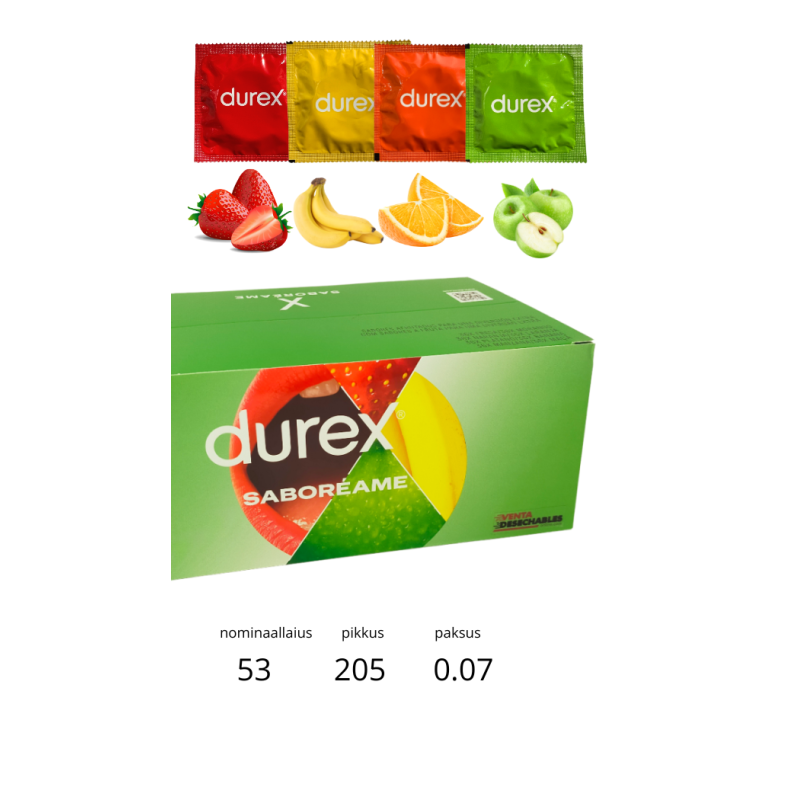 DUREX´i põnevate puuvilja aroomidega kondoomide mix sisaldab 36 maasika-, 36 õuna-, 36 banaani- ja 36 apelsini maitse- ja aroomiga kondoomi. Hõrkude maasikate, õunte, banaanide või apelsinide järgi lõhnav intiimne keskkond on ju kindlasti parem kui lateksi lõhn, mis paljudele ei meeldi.