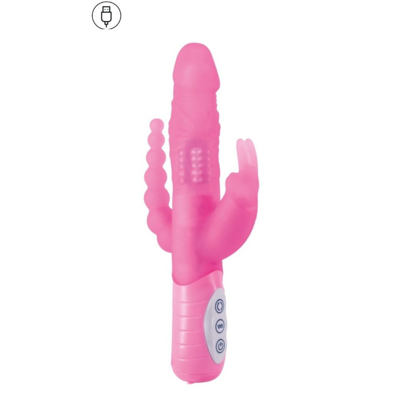 Kliitorit masseerib võimas "jänkukõrva" vibraator. Anaalselt pakub naudinguid tipu poole vähenevate kuulikeste jada.