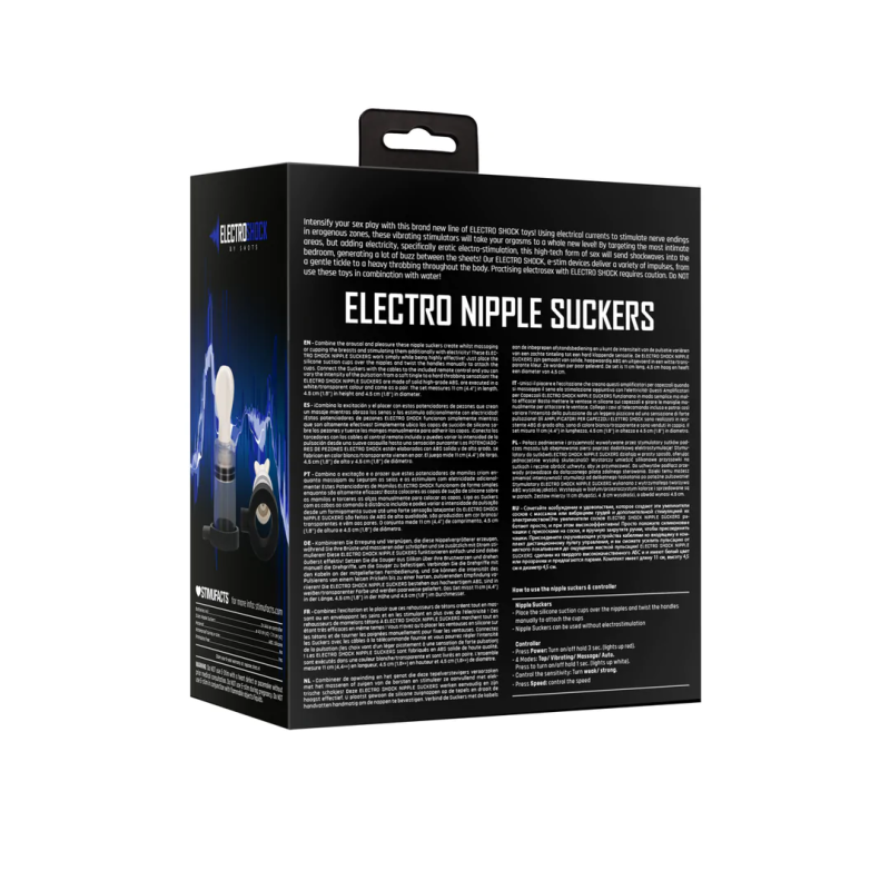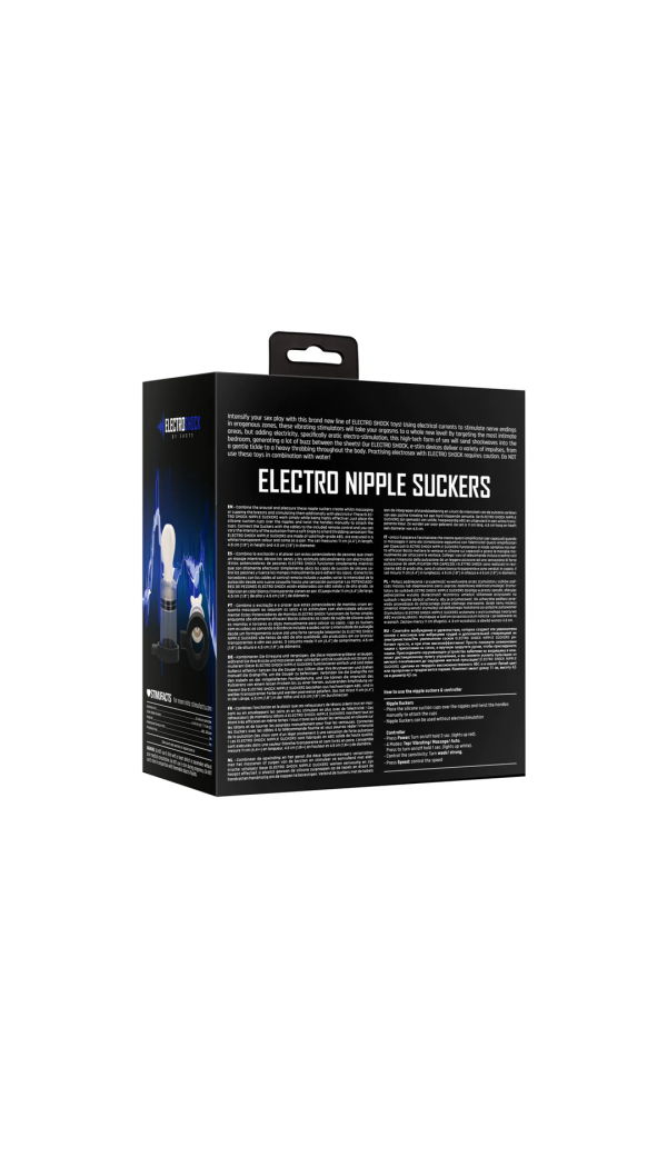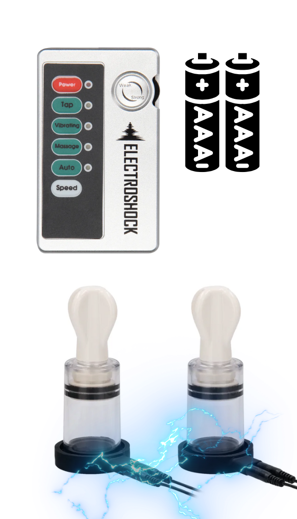 ElectroShock Bi-Polar Nipple Suckers — nibuklambrite paar vaakumi ja elektrostimulatsiooniga. ABS ja silikoon, suurus 11 × 4,5 cm, juhtimine puldiga, töötab 2 × AAA patareiga (ei kuulu komplekti).