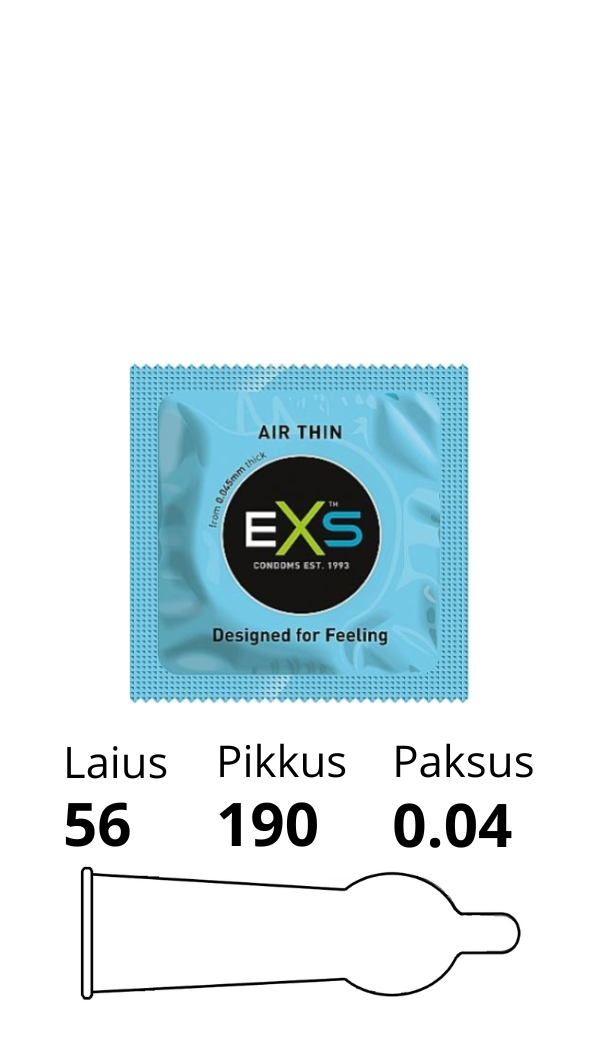 EXS Air Thin kondoomid (1 tk, 190 mm pikkus, 56 mm nominaallaius, 0,040-0,049 mm paksus) pakuvad erakordselt õhukest ja anatoomilise kujuga kaitset, ideaalsed neile, kes hindavad loomulikku tunnet ja turvalisust. EXS on populaarseim kondoomibränd UK-s, vegan, cruelty-free ja keskkonna- ning loomasõbralik. Ostes kondoomid üksikult, saad kontrollida oma ostude hulka, olles paindlik ja kuluefektiivne valik.