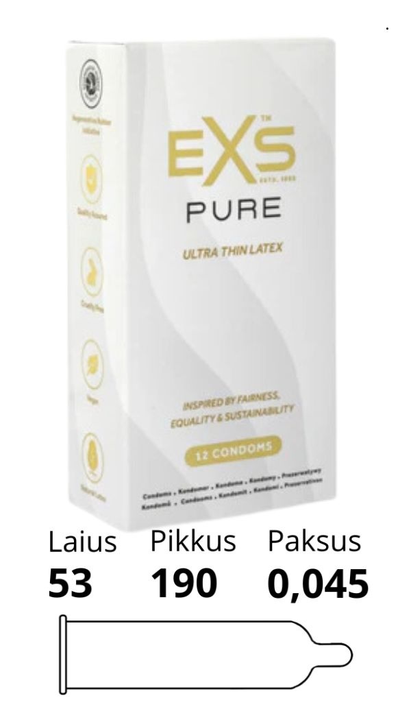 EXS Pure Thin kondoomid on kvaliteetsed kondoomid, mis on valmistatud naturaalsest lateksist ja millel on sirge kuju. Need on libestatud, õhukesed (0,045 mm), tugevad ja ilma lateksilõhnata. Kondoomidel on reservuaar ning need vastavad rangetele ISO ohutusstandarditele. Toodetud tehastes, kus teostatakse pidevat kvaliteedikontrolli.