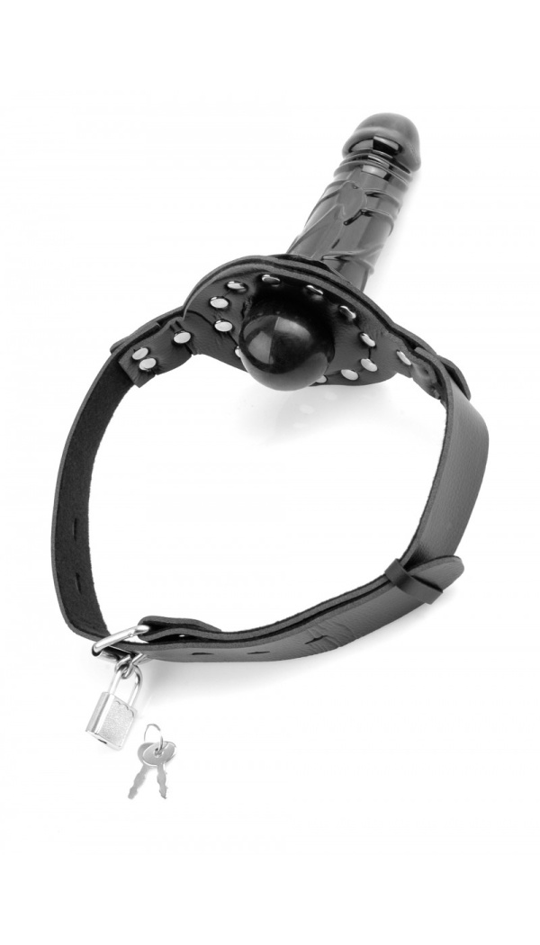 Rihmaga pähe kinnitatav suupall, mille otsas on 13 cm pikkune dildo.
