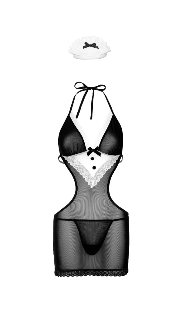 French Maid Roleplay Set – seksikas toateenija minikleit lahtise seljaga, pehmest läbipaistvast võrgust, pitsdetailidega põllekesega. Komplektis satiinist kaarega peakate.