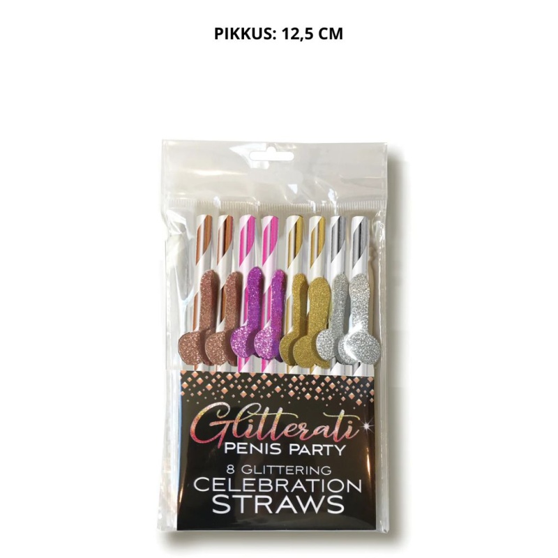 12,5 cm pikkused Glitterati peenisekujudega joogikõrred tõstavad teie järgmise poissmeeste- või aastapäevapeo VIP-staatusesse! Paberist kokteilikõrred on kauni metalse triibu ja sädeleva peenise aplikatsiooniga.