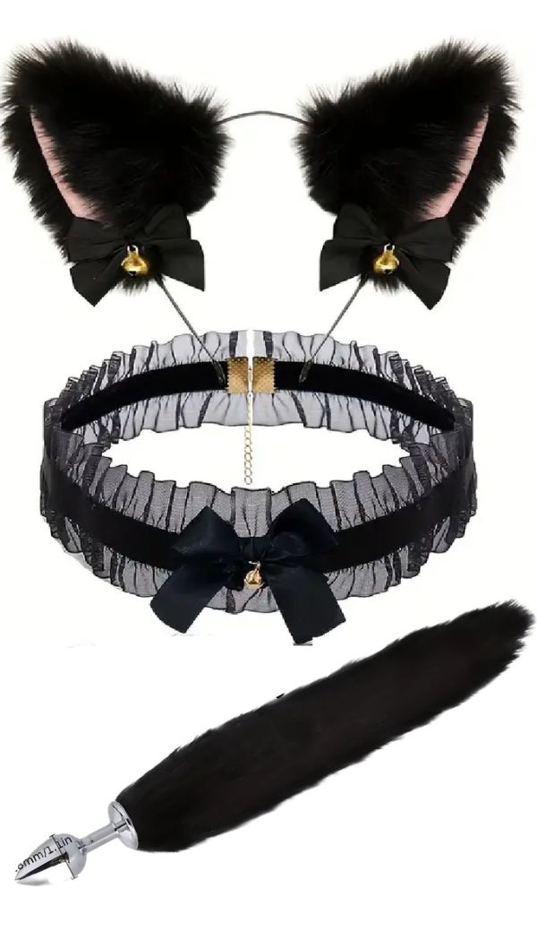 Kolmeosaline rollimängu komplekt, kuhu kuuluvad peavõruga pehmed kõrvakesed, kaelapael ja pika sabaga väike anaaltapp.