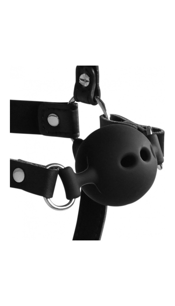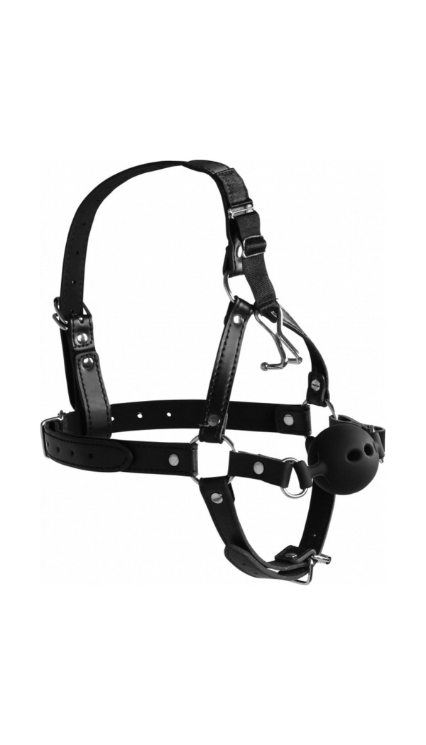 HEAD HARNESS WITH BREATHABLE BALL GAG AND NOSE HOOKS