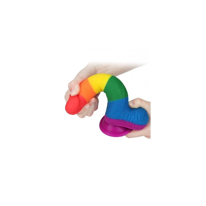 Kvaliteetsest silikoonist, hüpoallergeeniline munandite ja iminapaga, pehme ja hästi painduv, vikerkaarevärviline dildo.