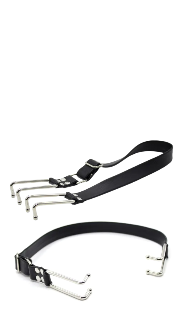 Strict Claw Hook Mouth Spreader – intensiivne suutapp metallkonksude ja reguleeritava vegan-nahast rihmaga, ideaalne domineerimis- ja alistumismängudeks.