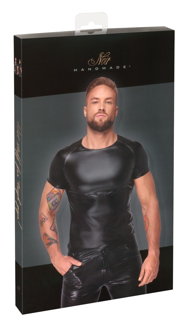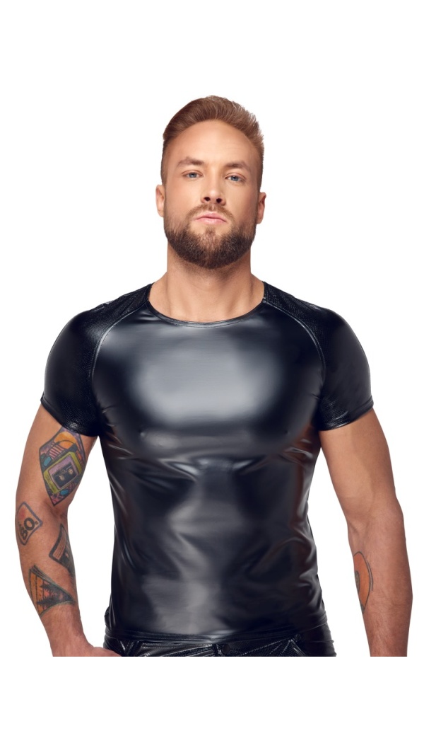 Seksikalt liibuv ja vormikat keha demonstreeriv wetlook lühikeste varrukatega särk.