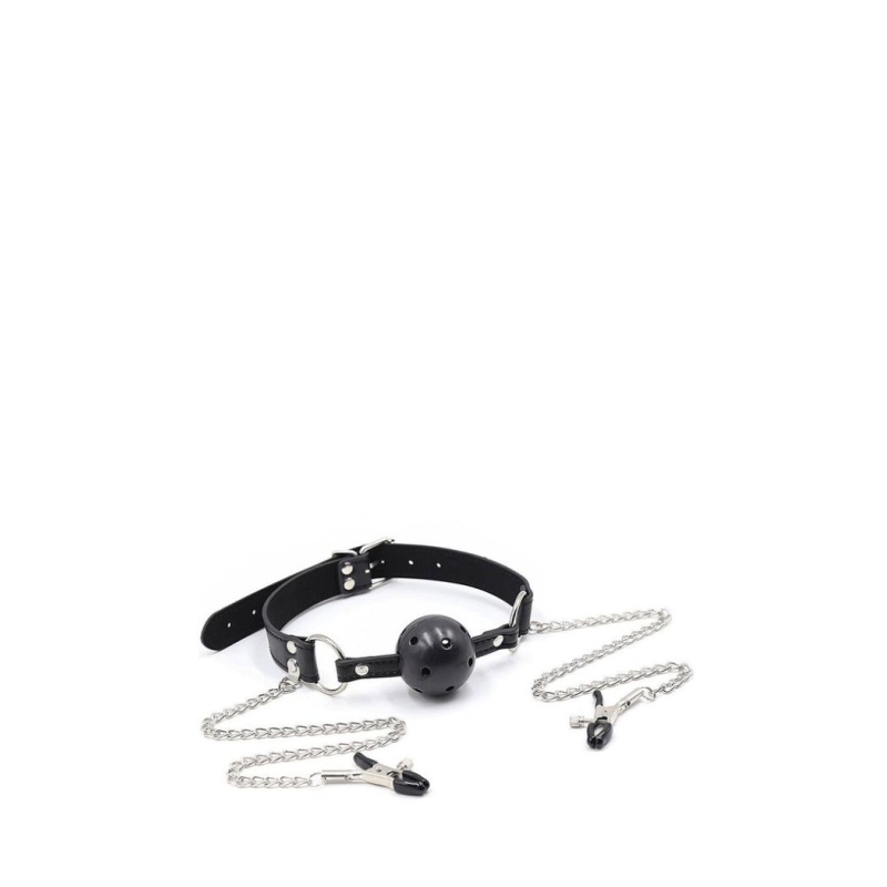 Fetišikomplekt suupalli, kettide ja nibuklambritega – julge ja pilkupüüdev aksessuaar neile, kes soovivad lisada mängu kontrolli, sensuaalsust ja uusi aistinguid. Hingav suupall tagab mugavuse, samas kui reguleeritava survega nibuklambrid ja metallketid loovad mitmekülgse kogemuse.