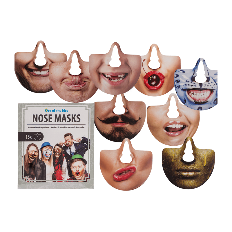 Tugevale paberile prinditud, nina peale kinnituvad, 15 erinevat maski.