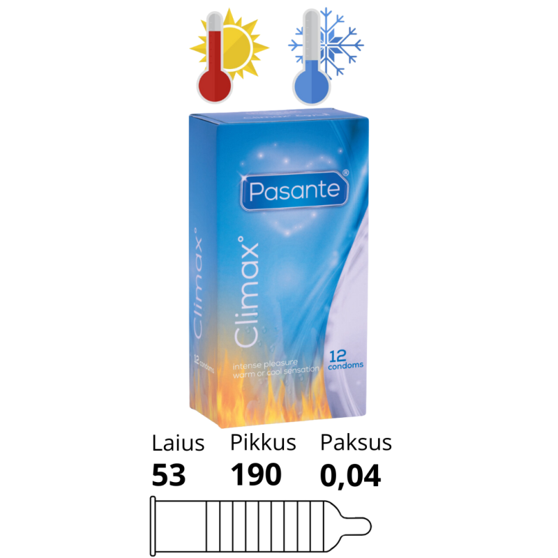 Pasante Climax kondoomid on ribilise pinnaga sirged kondoomid, mis on libestatud spetsiaalse libestiga, et tekitada veelgi rohkem kirge ja põnevust! Pakendis on 6 soojendava libestiga ja 6 jahutava libestiga kondoomi.