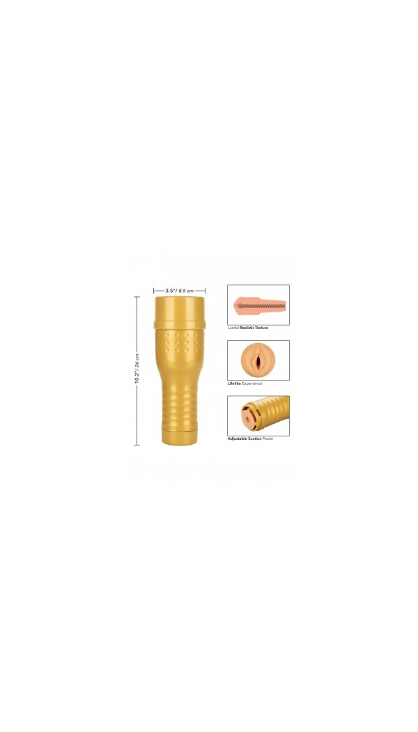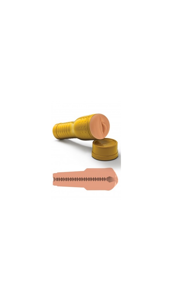 Vagiina on disainitud diskreetsesse, taskulambi kujulisse hoidikusse, mis on valmistatud kullavärvi plastikust.