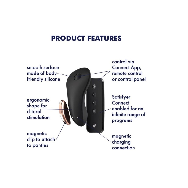 Satisfyeri firma uuenduslik kliitoristimulaator, mille saab magnetiga kinnitada püksikute külge ja kanda seda igapäevatoiminguid tehes või hoopis tänaval või kohvikus. Peopesasse mahtuva juhtpuldi abil saab vibraatorit sisse ja välja lülitada, samuti vahetada vibratsioonimustreid, lisaks ühendub toode tasuta Satisfyer Connect Appiga, pakkudes lugematul hulgal erinevaid vibreerimisrütme ja juhtimist ka kaugemalt, kasvõi teisest maailmaotsast! Põnevust lisab see, kui anda pult partneri kätte, saab ta Teid üllatada ja naudinguid pakkuda ühisel õhtusöögil või näiteks teisest toast!