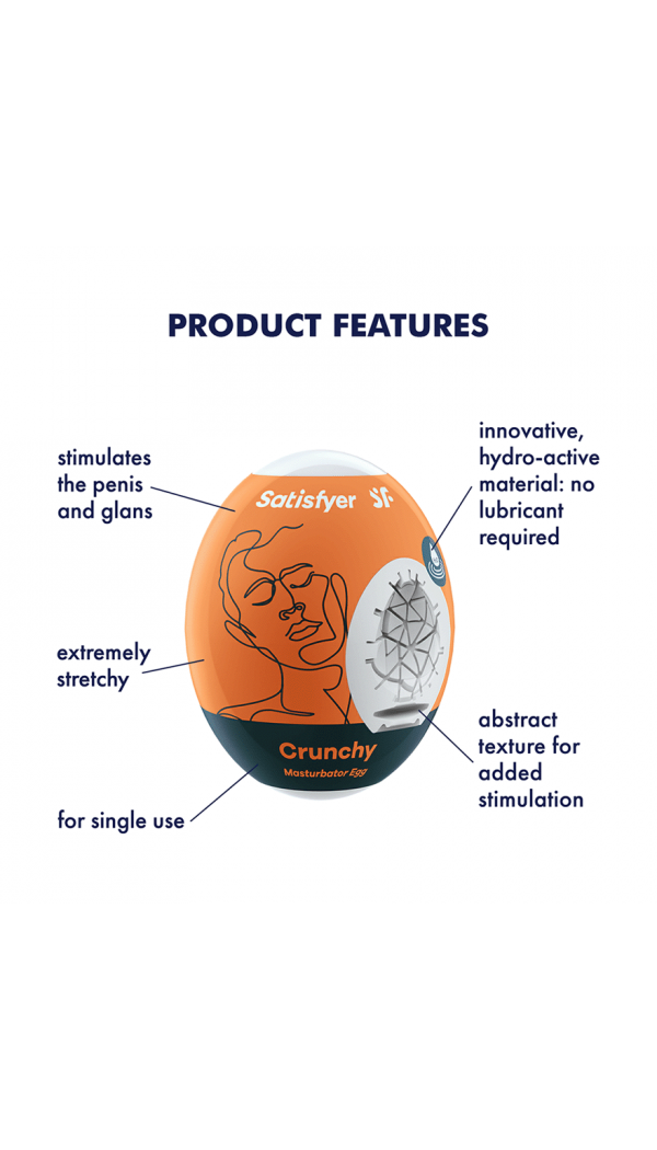 Satisfyer Crunchy Masturbator Egg on loodud pakkuma kiiret ja mugavat leevendust igal ajal ja igal pool. Kompaktne ja munakujuline disain muudab selle ideaalseks reisikaaslaseks või diskreetseks kasutamiseks kodust eemal. Erutav soonestruktuur tagab intensiivse stimulatsiooni iga liigutusega, pakkudes naudingut kogu peenisele.