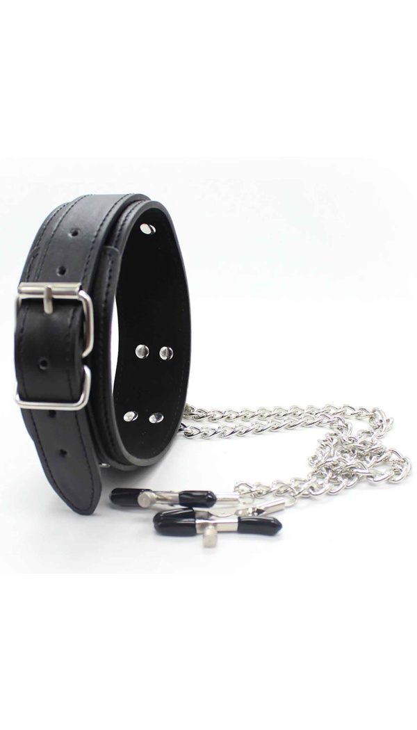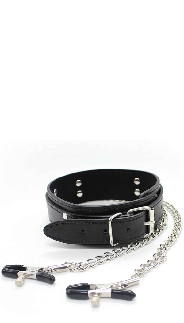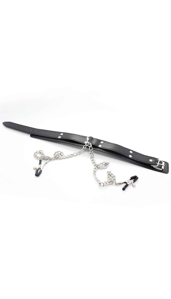 Too oma BDSM-kogemusse põnevust ja sensuaalset pinget selle elegantse komplektiga. Vastupidavast kunstnahast valmistatud reguleeritav kaelarihm on vooderdatud pehme neopreeniga. Kaelarihmast kulgeb kett otse paari metallist nibuklambrini, mille vinüülotsad lisavad mugavust ja pöidlakruvide abil saab survet reguleerida täpselt oma soovide järgi.