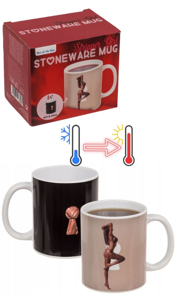 Kruus STRIPPER GIRL, mis reageerib kuumusele. Külmalt on pealispind must ja vaid lukuaugust saab piiluda kauni naise keha, kuuma joogi mõjul muutub kõik nähtavaks...
