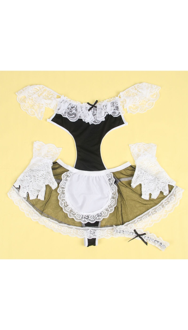 Seksikas toatüdruku kostüüm pitsist detailidega ja aksessuaaridega, et luua vastupandamatu välimus.