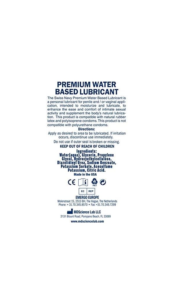 Swiss Navy Waterbased libesti on loodud pakkuma kauakestvat ja loomulikku libedust. Selle veepõhine koostis tundub nahal siidine, ei jäta kleepuvat tunnet ning on veega hõlpsasti mahapestav.