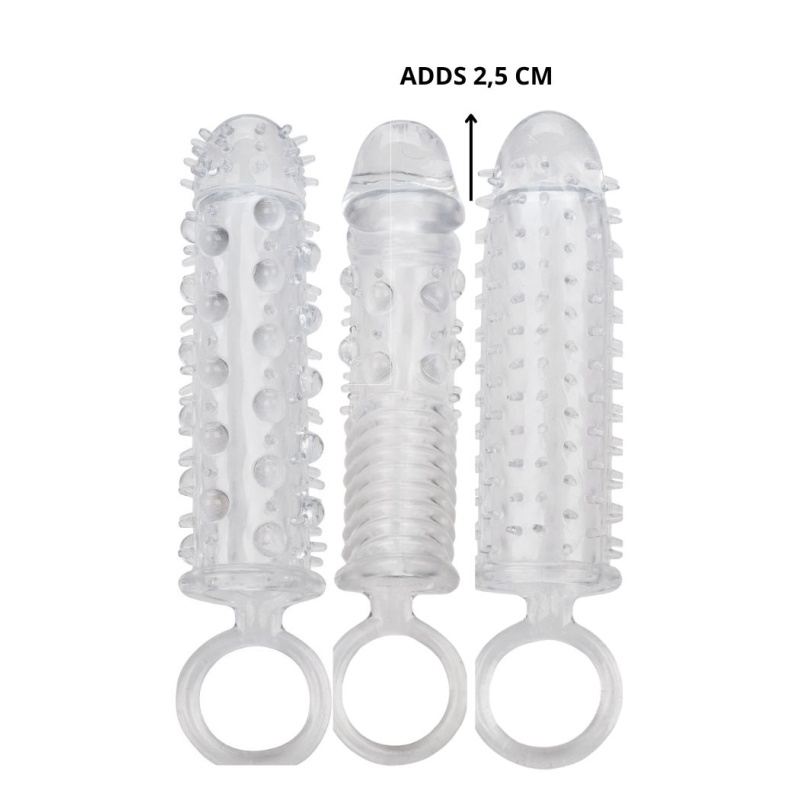 3-osaline komplekt koosneb kolmest tihedast peenisepikendusest, mille sees ja väljas on sooneline tekstuur intensiivseks stimulatsiooniks, et suurendada ümbermõõtu, pikkust ja plahvatuslikku naudingut kõigile asjaosalistele. Erootilise tugevdaja otsas on rõhutatud tugev peenisepea ja reservuaariots, mis pakub täiendavat 1 tolli naudingut. Samal ajal, kui erutate oma väljavalitu suurenenud ümbermõõdu ja stimuleerivate kõditajatega, annavad rahuldust pakkuva tugevdaja võimas erektsioonitugi ja tekstureeritud kamber teie mõlema jaoks plahvatuslikud tulemused. Tekstuuriga kamber ja tugirõngas pakuvad suuremat stimulatsiooni ja võimsat tuge.