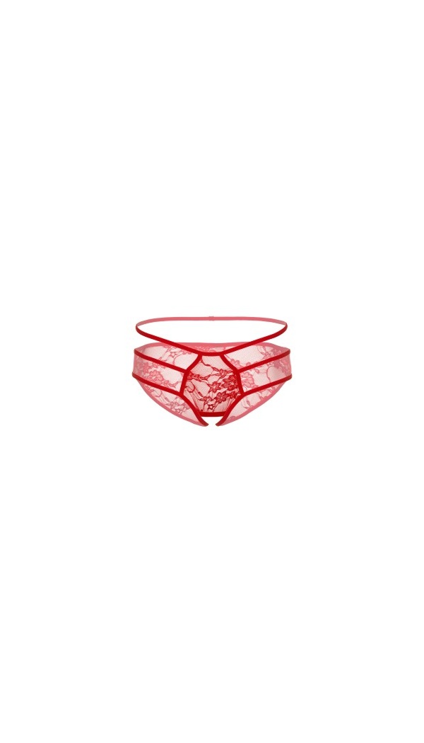 Punasest pitsist ja nöörikestega, alt avatud püksikud.