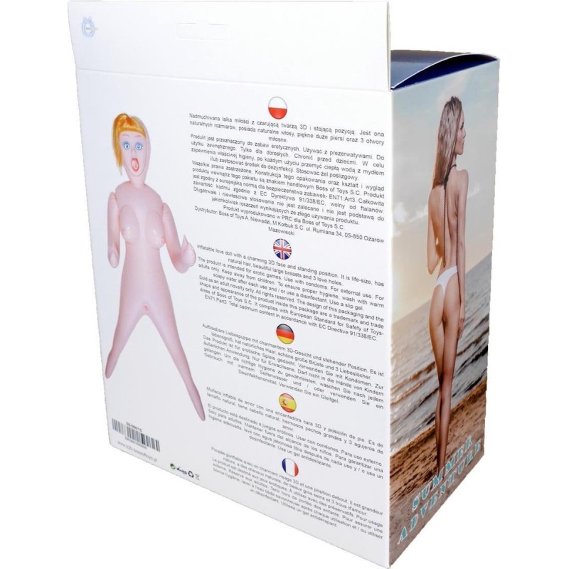 Helesiniste silmade ja kaunite blondide juustega suurte rindadega nukk, millel on kolm armutunnelit.