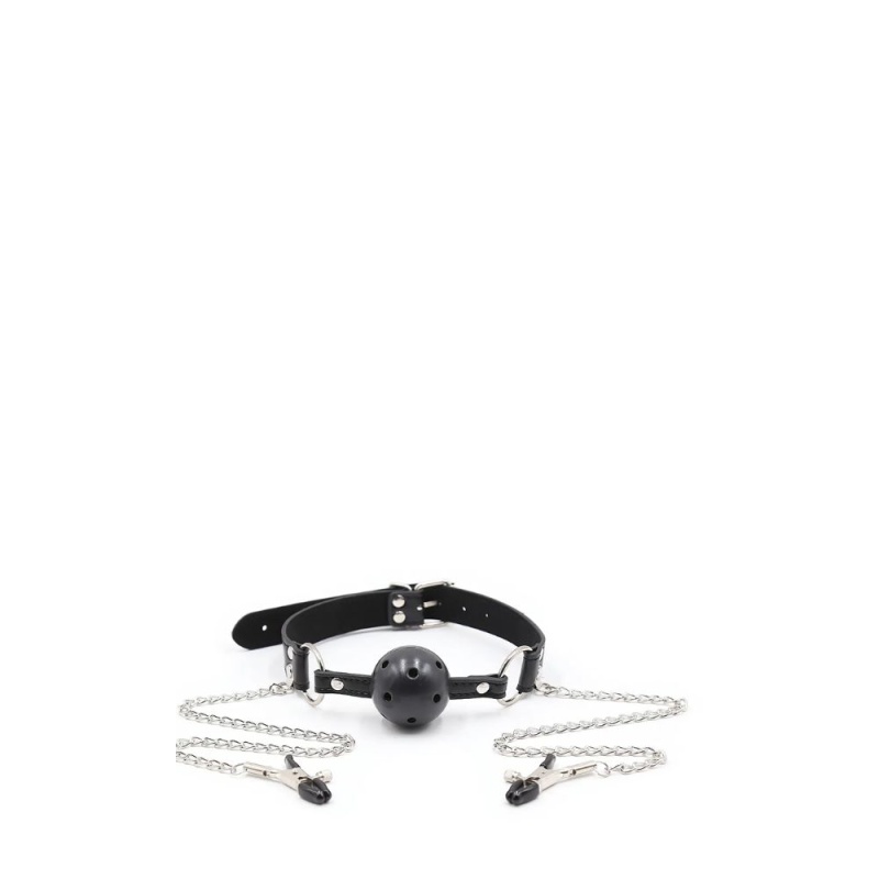 Avasta intensiivne nauding, mis ühendab kaks klassikalist BDSM-i elementi ühes võimsas aksessuaaris: hingamisavadega suupall ja reguleeritavad nibuklambrid. See elegantne must komplekt on loodud neile, kes soovivad kas täielikult kontrollist loobuda või selle julgelt enda kätte haarata.