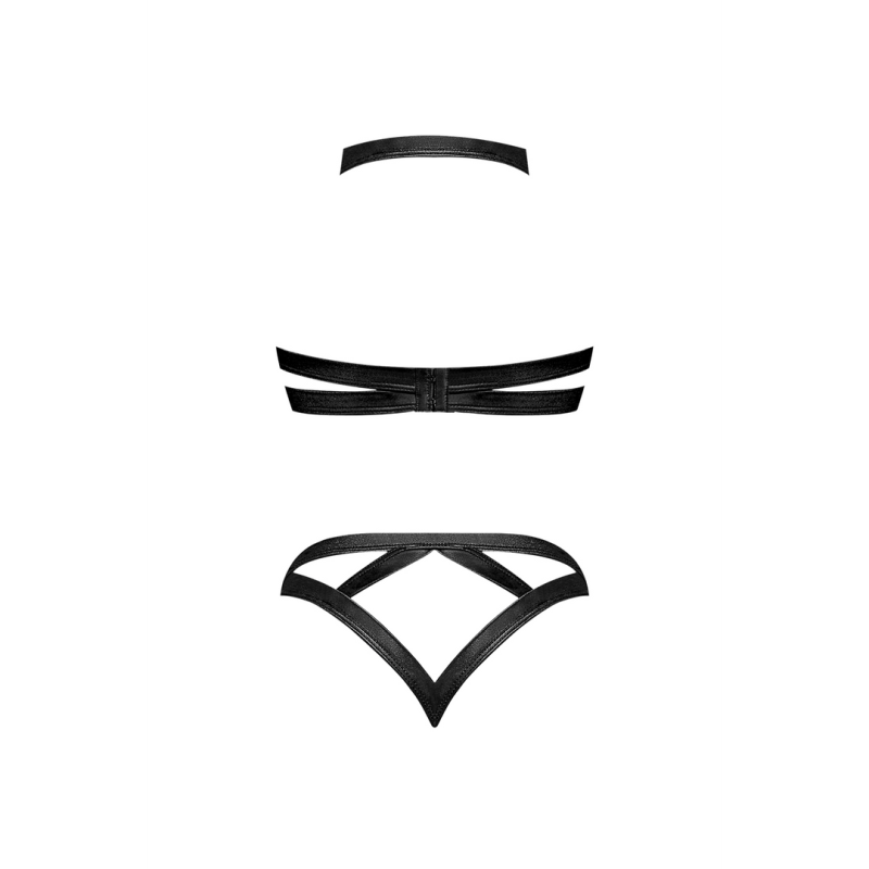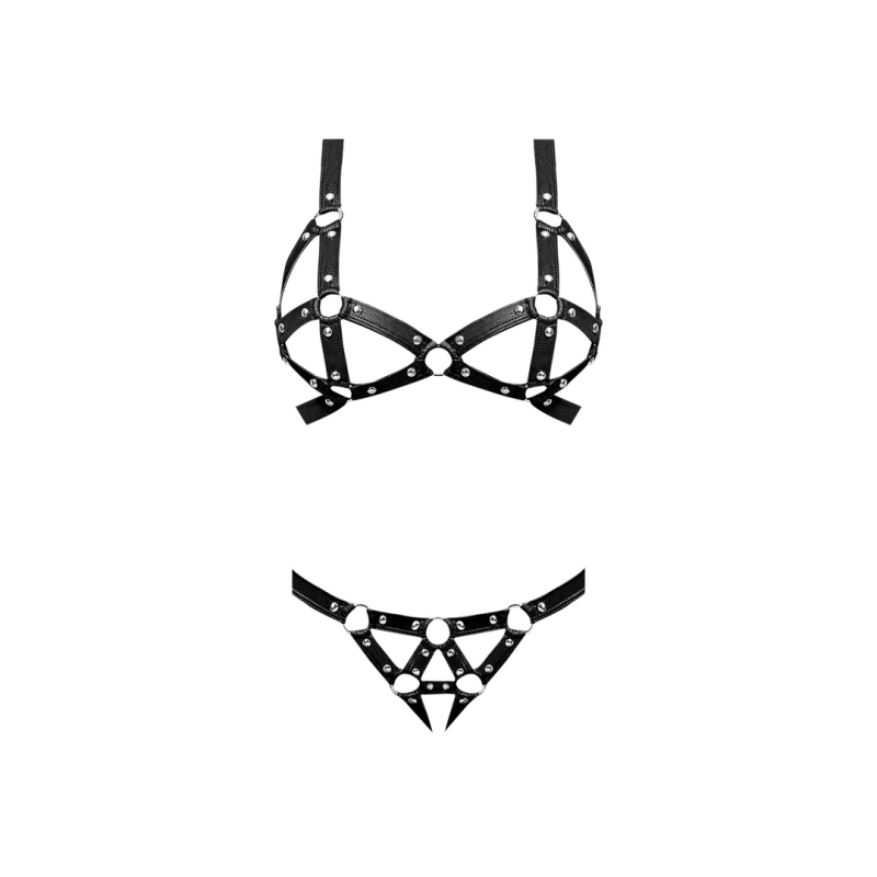 Strappy Halter Bra and Thong set, distinctive leather look, nickel plated studs and rongs, hook amd eye closures.
