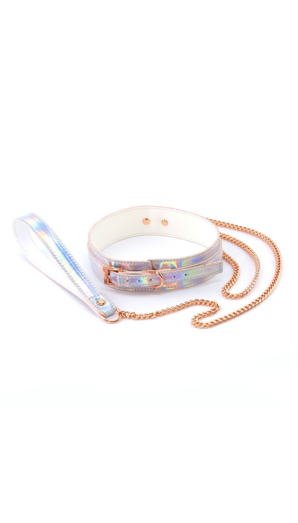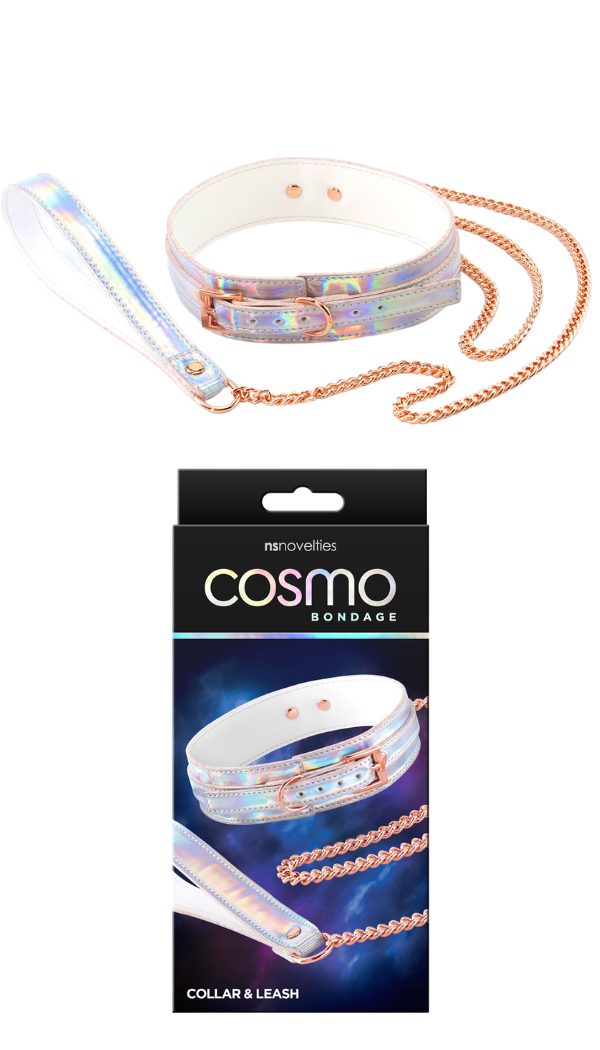 Light up the night with Cosmo's holographic restraints. Accented with Rose Gold nickle free hardware and fully adjustable for universal fit. Made from easy to clean Vinyl.