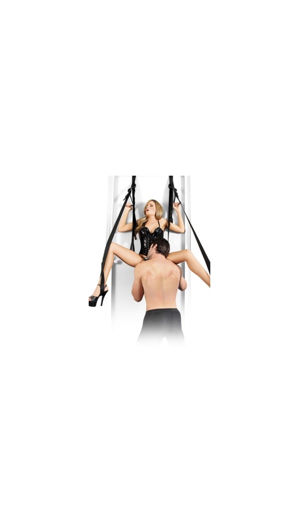 Turn an ordinary door in your home into a love swing in just minutes with this incredible Deluxe Fantasy Door Swing. Enjoy positions you never thought were possible and do it all with ease, thanks to the padded seat cradle, comfortable stirrups and perfectly-placed leverage handles. The deluxe swing requires no permanent installation or expensive tools and holds up to 300 lbs. Using two heavy-duty metal tubes to hang the swing from, the swings fits in your door jamb, between the frame and the door itself. The heavy-duty nylon support straps feature cross-stitching and are fully adjustable, allowing you to explore a variety of positions. Sit down on the padded seat, place your feet in the stirrups, and enjoy a wild ride! Best of all, you don't need a strong ceiling or fancy tools to get this door swing swinging into action. It sets up in minutes and easily tucks away in the closet or under the bed when the fun is over. Take it with you on vacation and turn your hotel into the ultimate bondage playground! Using the door swing is easy: Drape metal tubes over the top of the open door. Close and lock the door. Lower leg straps so that your lover can slide their thighs through the lower loops. Allow your lover to slide their arms through the upper loops, have them hold onto the handles for extra safety. Adjust the straps to a comfortable height. ]Have fun! Includes: Fully Adjustable Door Swing With Padded Seat (2) Metal Door Jamb Tubes (2) Acrylic Leverage Handles Free Satin Love Mask *Maximum weight capacity = 300 lbs.