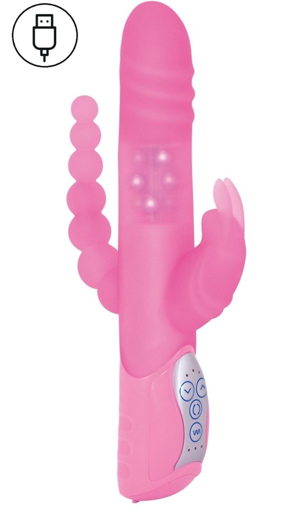 Kliitorit masseerib võimas "jänkukõrva" vibraator. Anaalselt pakub naudinguid tipu poole vähenevate kuulikeste jada.