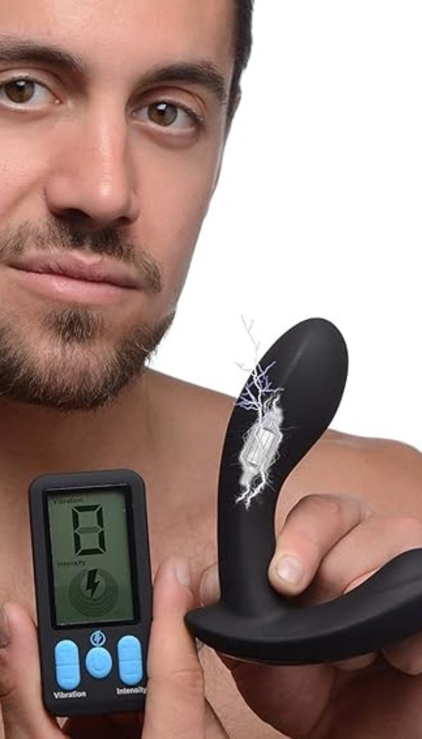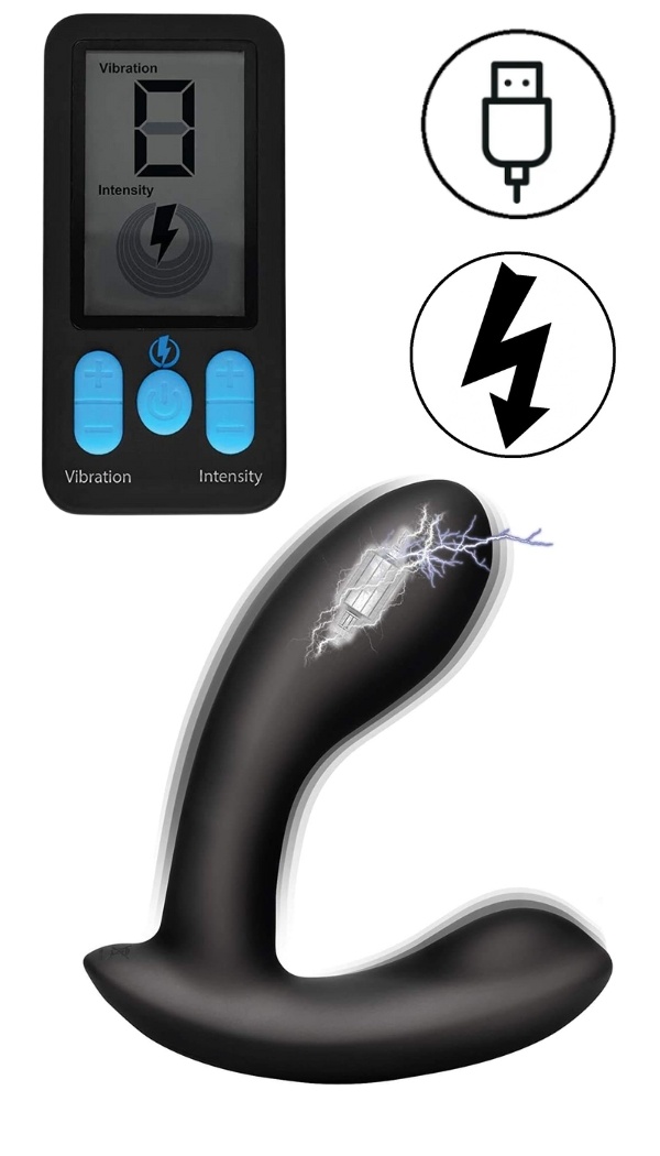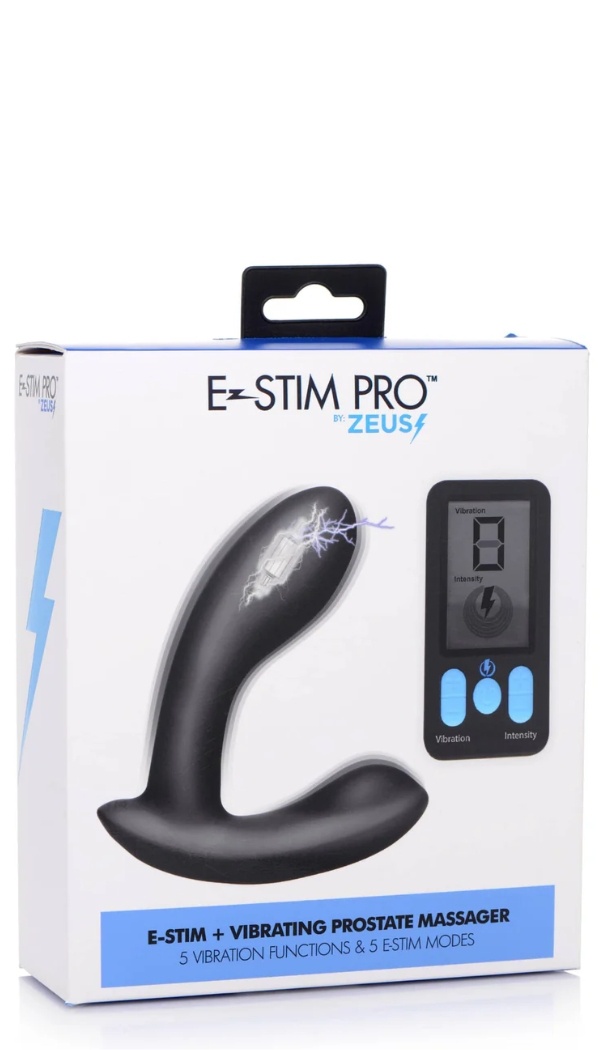 Designed to give a shock to your system, this Vibrating E-Stim Prostate Massager is the pinnacle of intense male pleasure - indulge in the electrifying world of electro play with a toy that makes it easy to insert and enjoy, no power boxes or connection systems required! Shaped for precise prostate stimulation and full body perineum vibes to push your orgasm to mind bending levels - excellent for solo use or with a partner.The built in dual motors provide 5 vibration functions while the hidden electrodes shock your insides with 5 different functions! Flip through each function and find which combination of vibes and shocks suits your playstyle best. The ergonomic shape is designed to stimulate your prostate and perineum in tandem for full booty pleasure, elevating your orgasms to new heights while sitting between your cheeks in comfort.Zeus E-Stim Pro toys feature a wireless controller with a large easy-to-read display so you can see exactly which vibration and shocking intensity is currently active. Perfect for finding the ideal combination of vibes and shocks to elevate your pleasure to its peak!Each premium offering in the Zeus E-Stim Pro line are rechargeable via included USB charging cable, and are constructed with velvety smooth silicone materials that are phthalate-free and latex-free for a body-safe experience. The luxurious silicone materials are compatible with water based lubricants only.