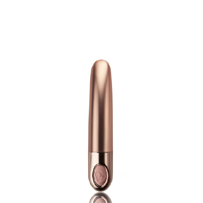 Roosakas-kuldset värvi elegantsel minivibraatoril on voolujooneline ja pehme kontuur, kitsenev ots ja sametiliselt sile viimistlus.