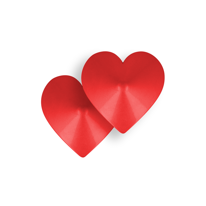 Плотные и слегка изогнутые наклейки на соски в форме красных сердечек с блестящей металлизированной поверхностью. Надежный и безопасный для кожи клеевой слой, многоразовое использование.