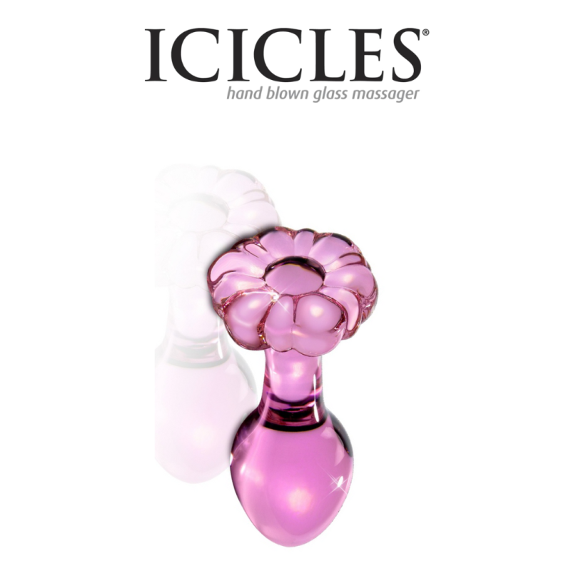 Läbipaistvast roosast klaasist anaaltapp, mille otsas on kaunis lillemotiiv.