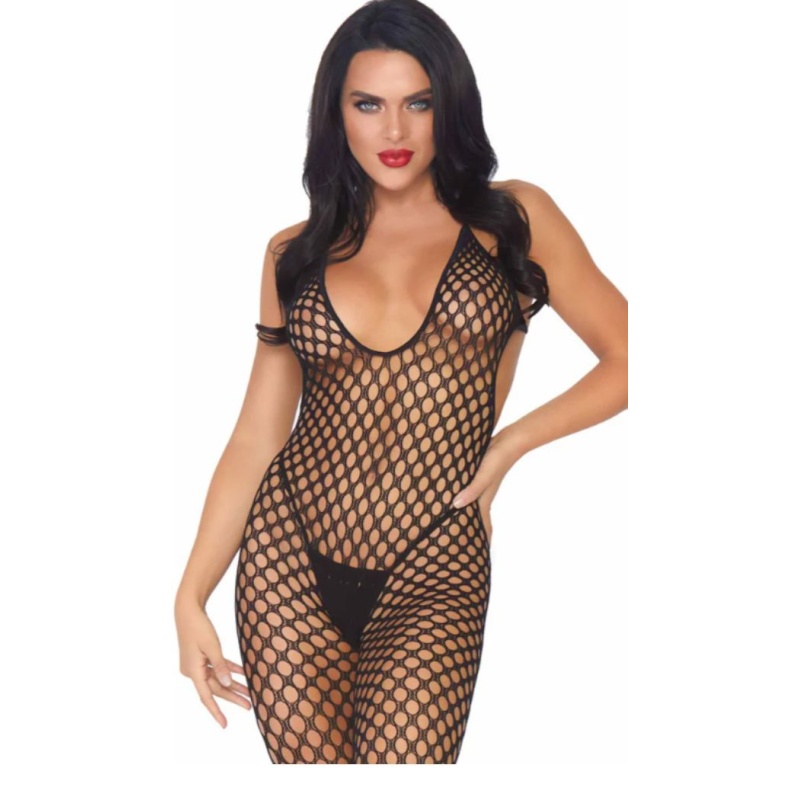 Õmblusteta, lahtise seljaosa, avatud jalgevahe ja ilma pöiaosata mustast võrgust kehasukk.
